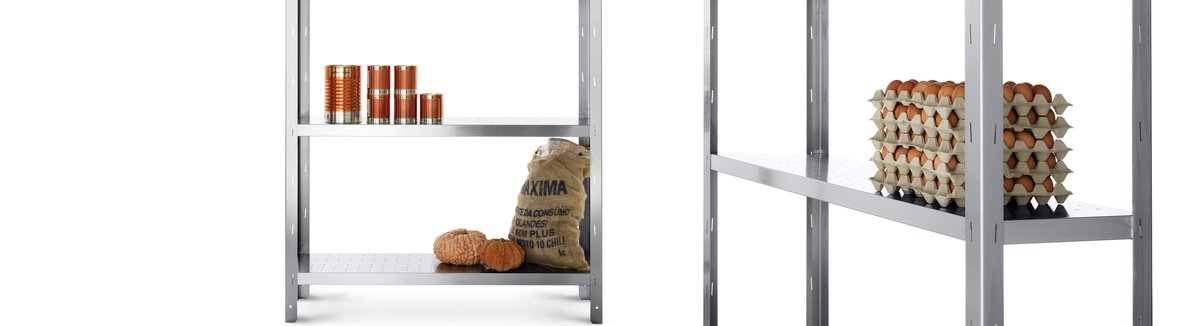 Die Edelstahlregale von Tuls bieten offene, hygienische Lagerfläche auf vier Ebenen. Die Böden sind einzeln höhenverstellbar, die Standfüße nivellierbar — so passt sich jedes Regal flexibel an Ihre Raumsituation an. AISI 304 Edelstahl für Langlebigkeit und einfache Reinigung.