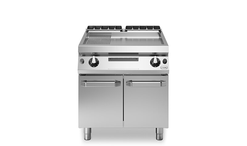 Elektro-Bratplatte ROC 70/80 2/3 glatt 1/3 Rillenplatte 10,8 kW Fach mit Türen
